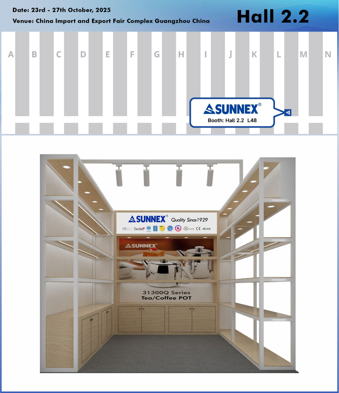 Guangzhou, China – outubro de 2025 – SUNNEX Century (Shenzhen) Ltd., fabricante líder de utensílios premium para buffet, rechauds, dispensadores de bebidas e utensílios domésticos, tem o prazer de convidar compradores internacionais, mídia e profissionais da indústria para visitar nossos estandes na 138ª Feira de Importação e Exportação da China (Feira de Cantão).