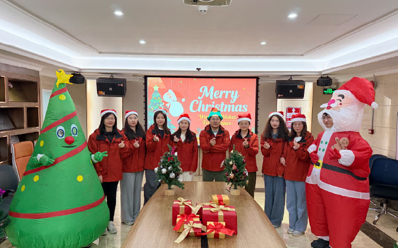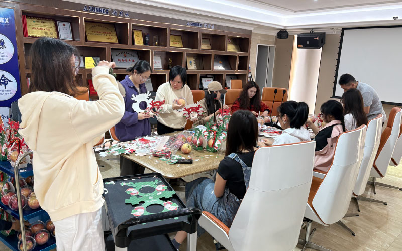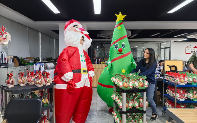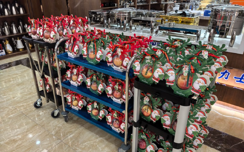 Cantou uma música: “Desejamos a você um Feliz Natal, desejamos-lhe um Feliz Natal….”, linda e grande maçã vermelha embalada, significando paz, e então nosso Papai Noel nos enviou duas maçãs pacíficas por equipe com felicidade dupla, nossa, tão doce como uma grande família.
